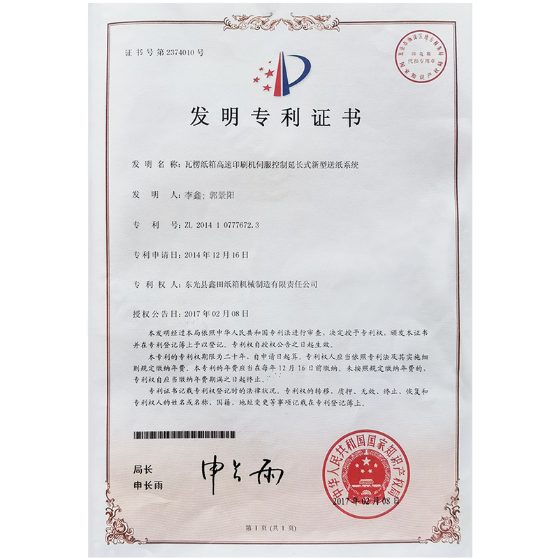 〖2〗伺服免压前缘滚轮送纸系统(多排送纸轮,每排送纸轮配一台伺服电机独立驱动,同时启动不同时停止,实现延长送纸),对纸板的瓦楞零压力,保持纸板原有的抗压强度。